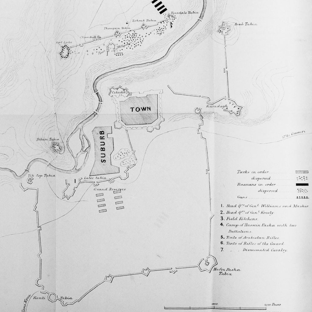 На второй — схема городских укреплений того же периода. Квадратик TOWN и Citadel в его уголке разглядели? Вот это был, собственно, турецкий город и крепость над ним. А там, где надпись SUBURB — там потом, при русской оккупации, разбили регулярные кварталы и построили те самые «балтийские-петербургские» дома. Ну а вокруг, по широкому квадратному периметру — система редутов, и в левом нижнем углу схемы — редут с надписью Kanli Tabia, видите? На современном турецком будет Kanlı Tabya — дословно ‘кровавый редут’.