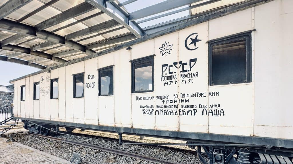 Завершается она «белым вагоном», подаренным командующему турецким Кавказским фронтом Кязыму Карабекиру в 1921 году Советским правительством. При поновлении окраски знатоков русского языка в музее не нашлось, поэтому «турецкий» превратился в «турский», «Красная армия» — в «Квасную», а «национальное собрание» — в «на ональное сование» (какая ирония, какой постмодерн!)